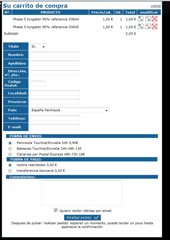 Una vez terminada tu compra sólo tienes que rellenar los datos, elegir la forma de ennvío y de pago y pulsar "Realizar pedido", y ya tienes tu compra hecha. |