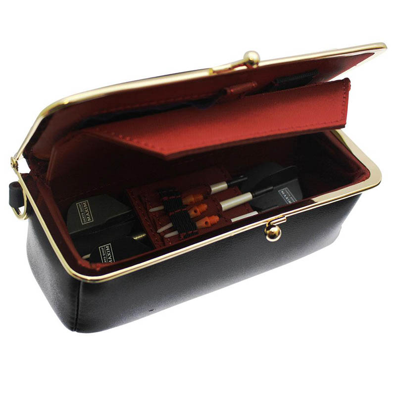 Funda de gran calidad, con gran capacidad ya que su forma es similar a un bolso pequeño de mano con cierre tipo clip y tiene una profundidad de 6cm útiles aprox., tiene capacidad para un juego de dardos y repuestos. Es una funda que protege a la perfección todo lo transportado en ella ya que su es bastante rígido.