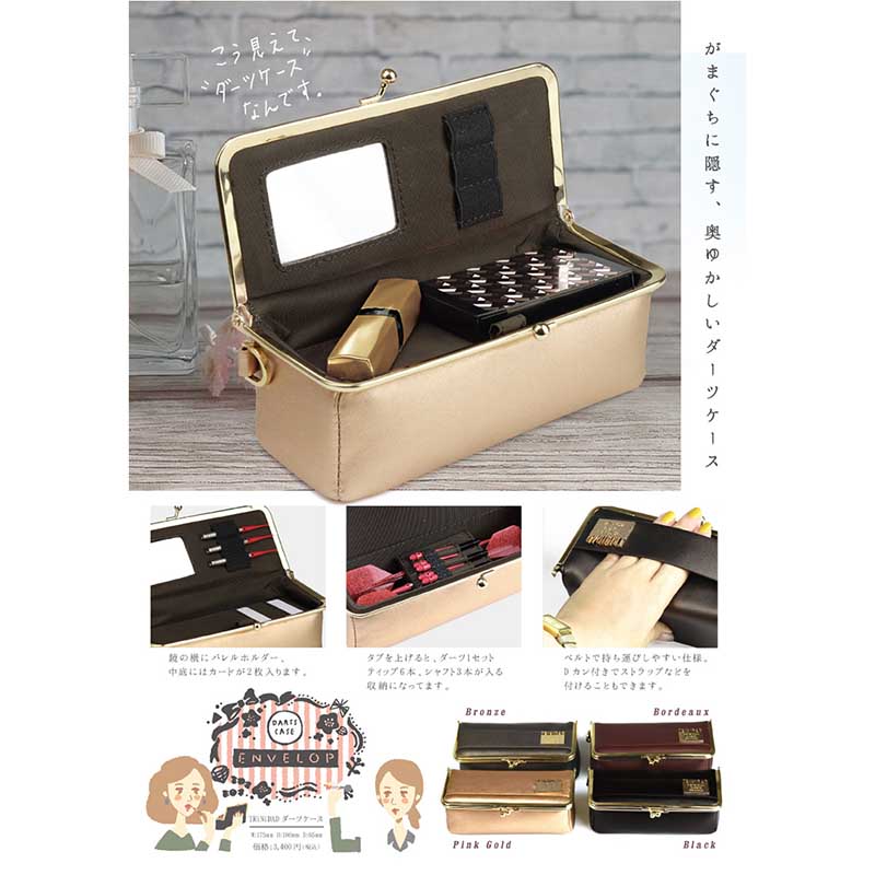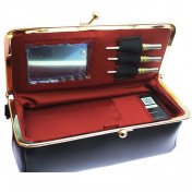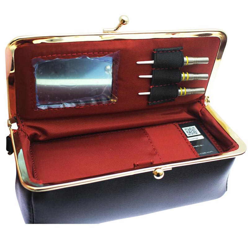 Funda de gran calidad, con gran capacidad ya que su forma es similar a un bolso pequeño de mano con cierre tipo clip y tiene una profundidad de 6cm útiles aprox., tiene capacidad para un juego de dardos y repuestos. Es una funda que protege a la perfección todo lo transportado en ella ya que su es bastante rígido.