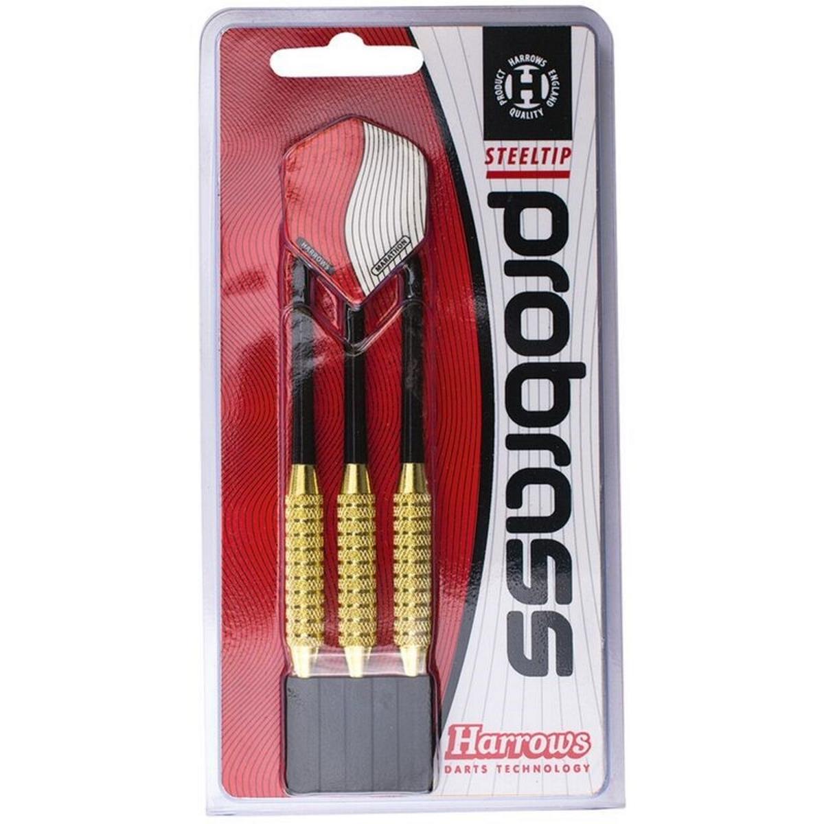 El juego de dardos se compone por 1 set de 3 cuerpos Pro Brass Medium, 1 set de 3 cañas Harrows y 1 set de 3 plumas Harrows.