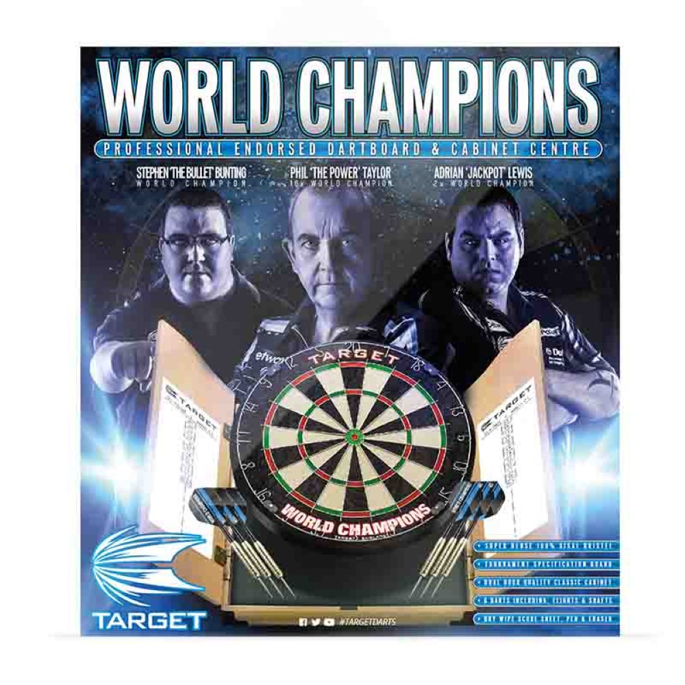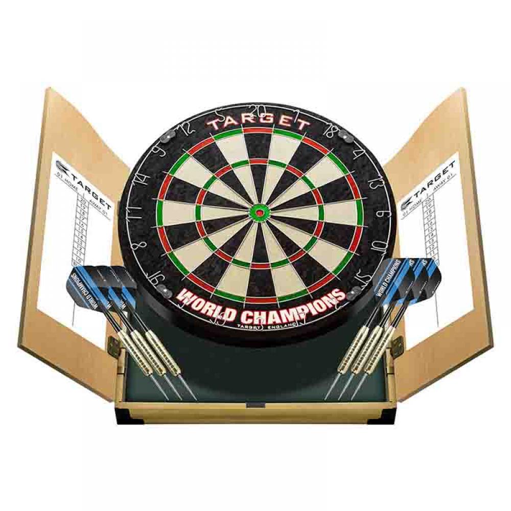 Centro completo para jugar a los dardos, incluye armario y diana de la marca Target Darts modelo World Champions.