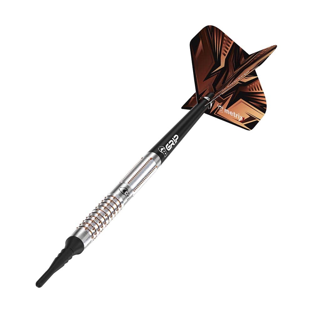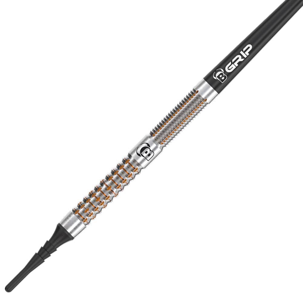 El juego de dardos Bulls Darts DE Adon se compone por 1 set de 3 cuerpos, 1 set de 3 cañas Bulls Grip negras, 1 set de 3 plumas Bulls Metrix Standard y 3 puntas de plástico rosca 2ba.