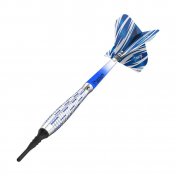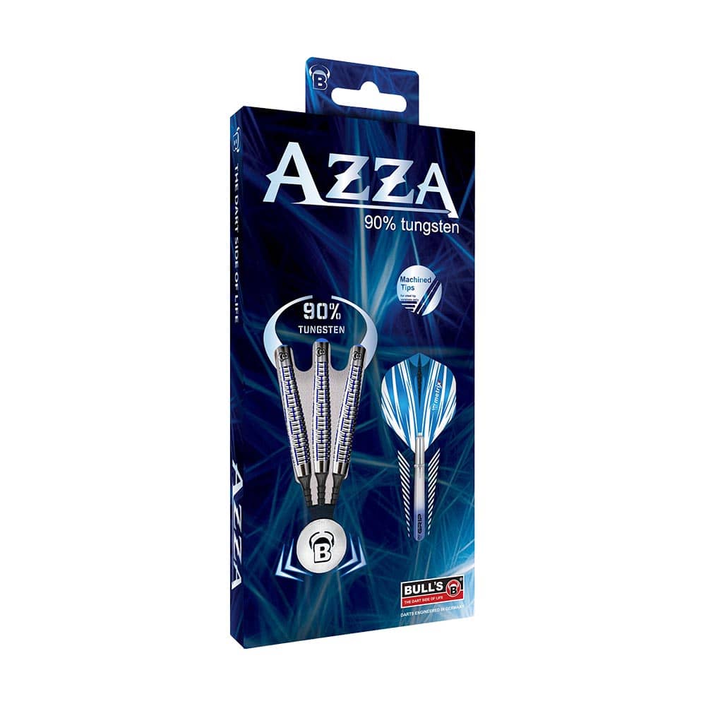El juego de dardos Bulls Darts DE Azza se compone por 1 set de 3 cuerpos, 1 set de 3 cañas Bulls Grip azul transparente y 1 set de 3 plumas Bulls Metrix Standard Azul y 3 puntas de plástico rosca 2ba.