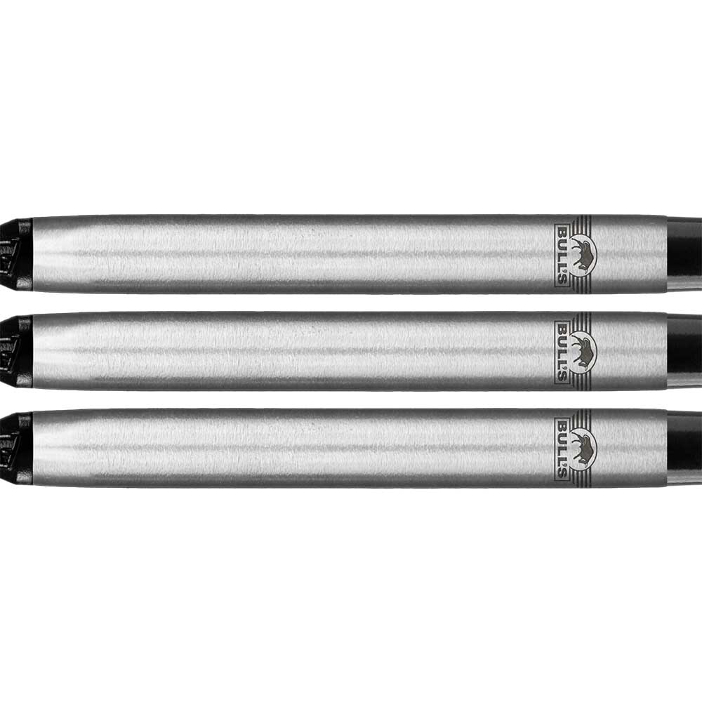El juego de dardos se compone por 1 set de 3 cuerpos Bulls Andy Baetens con punta de acero, 1 set de 3 cañas Bulls Nylon Medium Negro y 1 set de 3 plumas