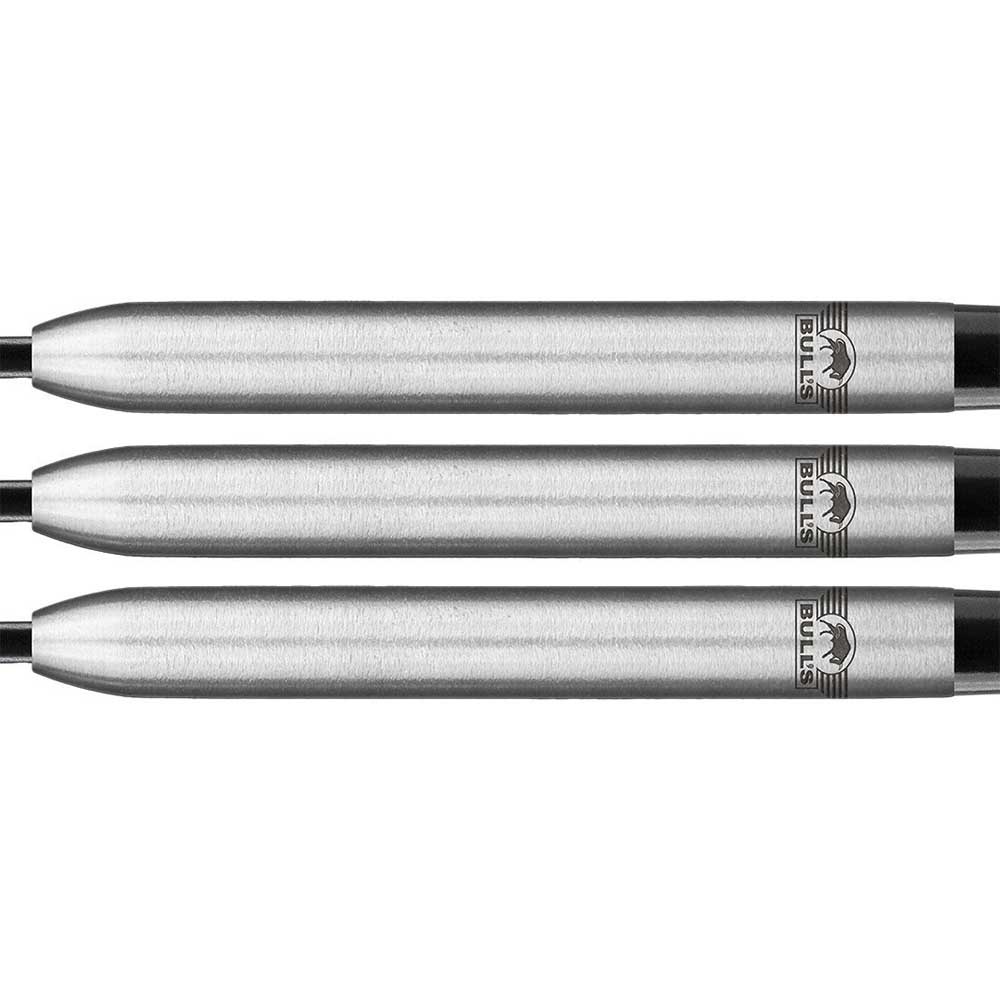 El juego de dardos se compone por 1 set de 3 cuerpos Bulls Andy Baetens con punta de acero, 1 set de 3 cañas Bulls Nylon Medium Negro y 1 set de 3 plumas