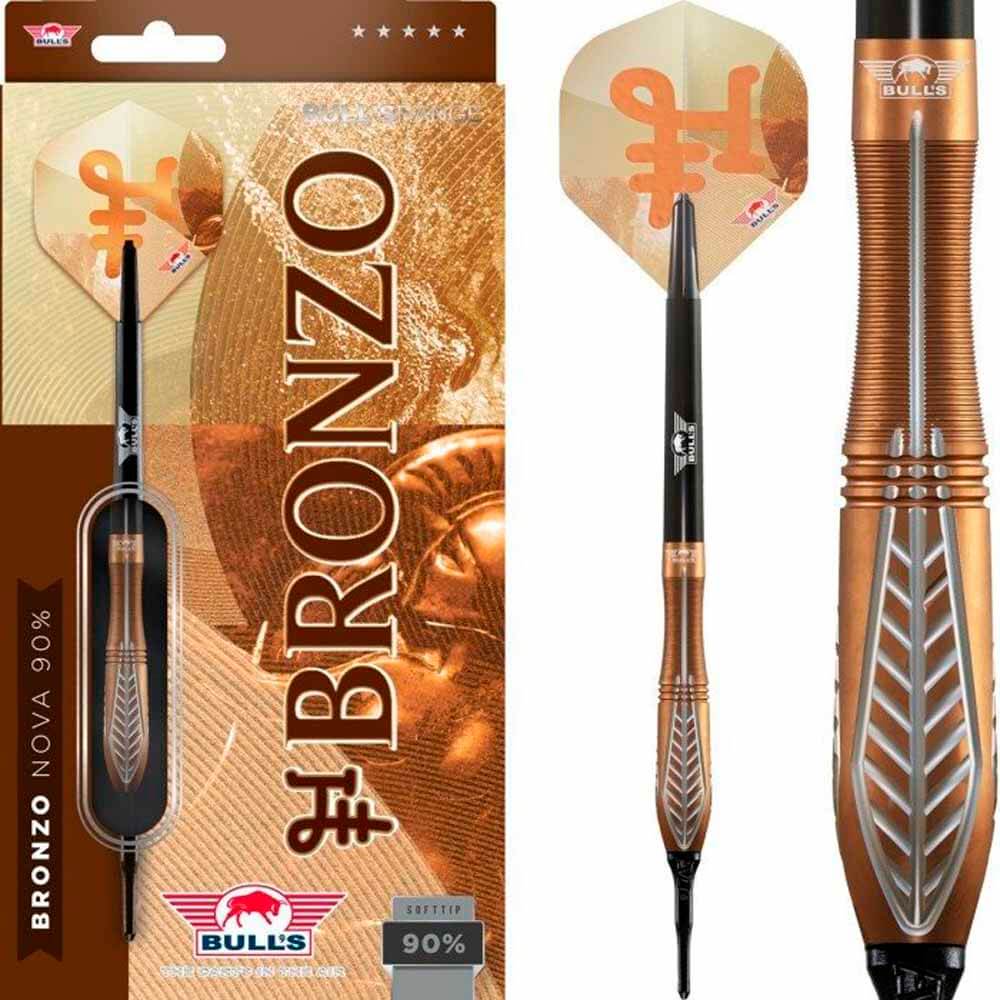 El juego de dardos se compone por 1 set de 3 cuerpos Bronzo Nova, 1 set de 3 cañas Bulls, 1 set de 3 plumas y 1 set de 3 puntas 2ba 4mm