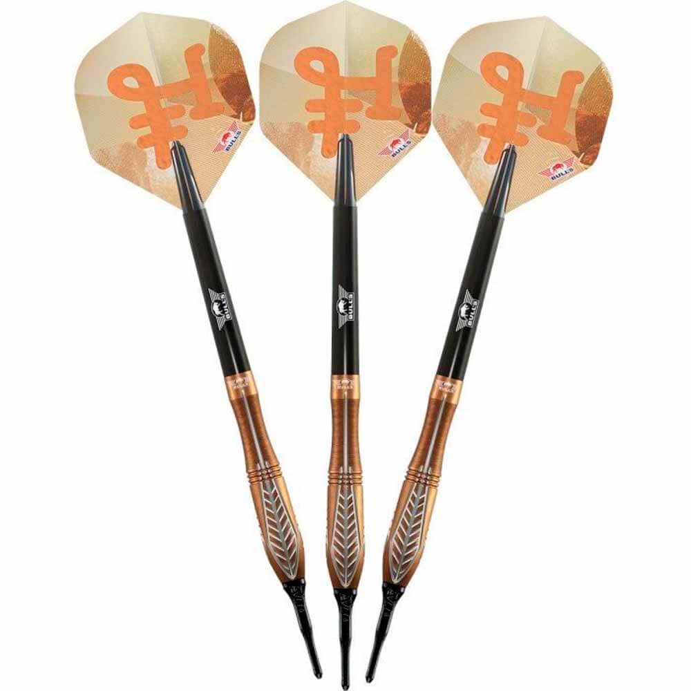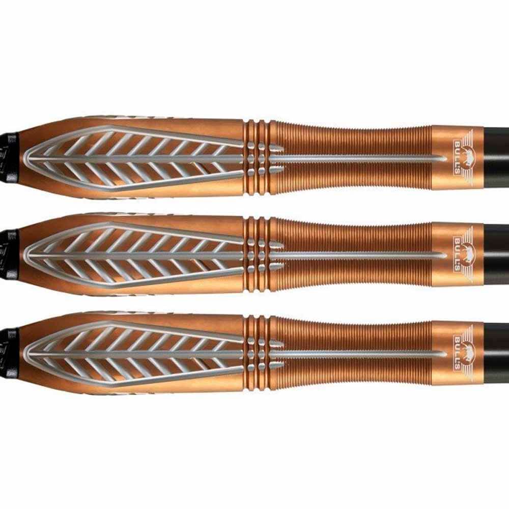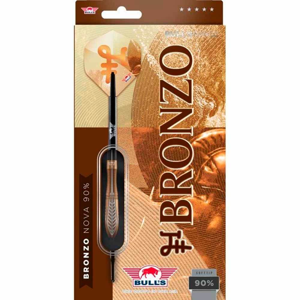El juego de dardos se compone por 1 set de 3 cuerpos Bronzo Nova, 1 set de 3 cañas Bulls, 1 set de 3 plumas y 1 set de 3 puntas 2ba 4mm