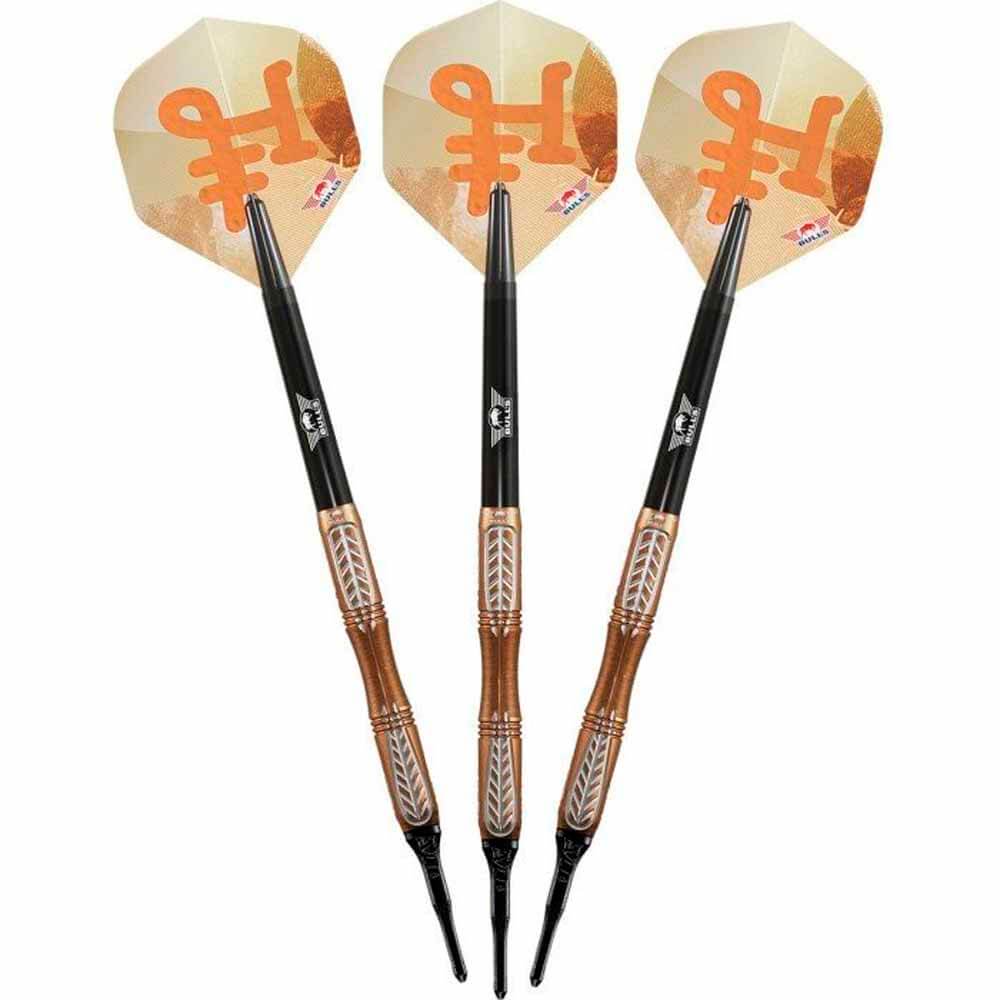 El juego de dardos se compone por 1 set de 3 cuerpos Bronzo True , 1 set de 3 cañas Bulls, 1 set de 3 plumas y 1 set de 3 puntas 2ba 4mm