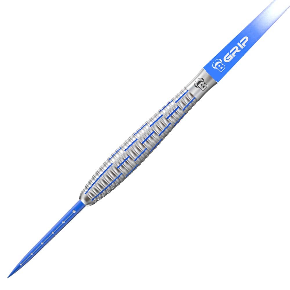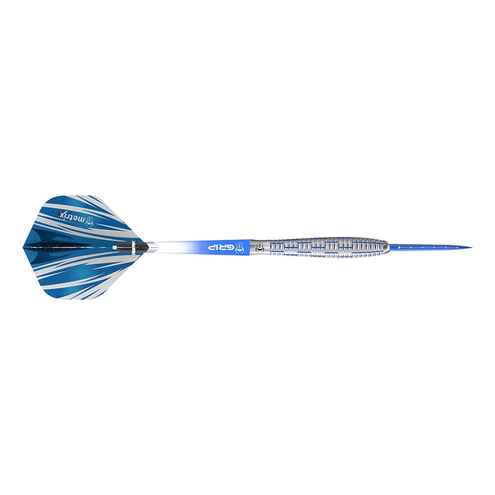 El juego de dardos Bulls Darts DE Azza se compone por 1 set de 3 cuerpos con punta de metal, 1 set de 3 cañas Bulls Grip azul transparente y 1 set de 3 plumas Bulls Metrix Standard Azul.