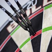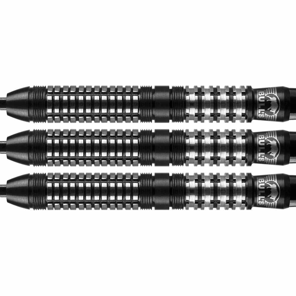 El juego de dardos se compone por 1 set de 3 cuerpos Bulls Luna Neoma con punta de acero, 1 set de 3 cañas Bulls Nylon Medium Negro y 1 set de 3 plumas