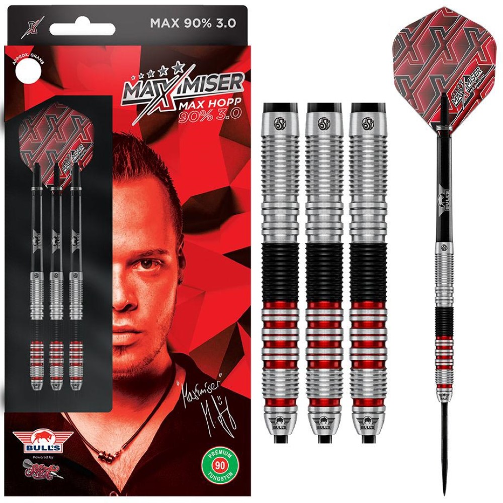El juego de dardos se compone por 1 set de 3 cuerpos Max Hopp Maximiser , 1 set de 3 cañas Bulls, 1 set de 3 plumas y 1 set de 3 puntas Steel tip