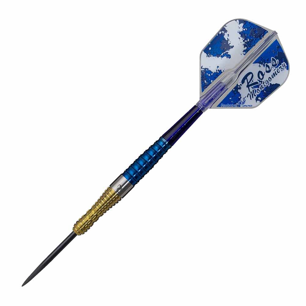 El juego se compone por 1 set de 3 cuerpos Cosmo Darts Ross Montgomery con punta de metal, 1 set de 3 cañas Fit shaft y 1 set de 3 plumas Fit flight diseño Ross Montgomery.