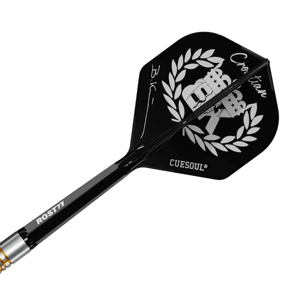 El producto se compone por 1 set de 3 cuerpos de dardos Cuesoul Boris Krcmar, 1 set de 3 plumas con caña integrada Cuesoul Rost 77, 3 puntas de acero, varias puntas de plástico, una llave para cambiar puntas OTO y 1 piedra de afilar puntas.