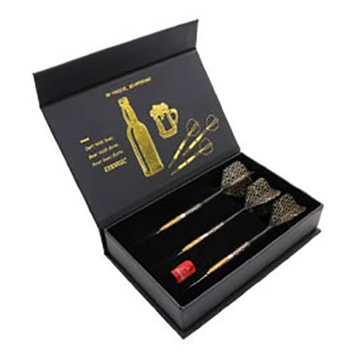 El juego de dardos se compone por 1 set de 3 barriles de dardos de tungsteno con diseño Cola Beer de barril al 90 %, elegante barril de dardos con superficie acabada con pintura al óleo, ofrecen un gran agarre, incluye también 1 ser de 3 plumas ROST .