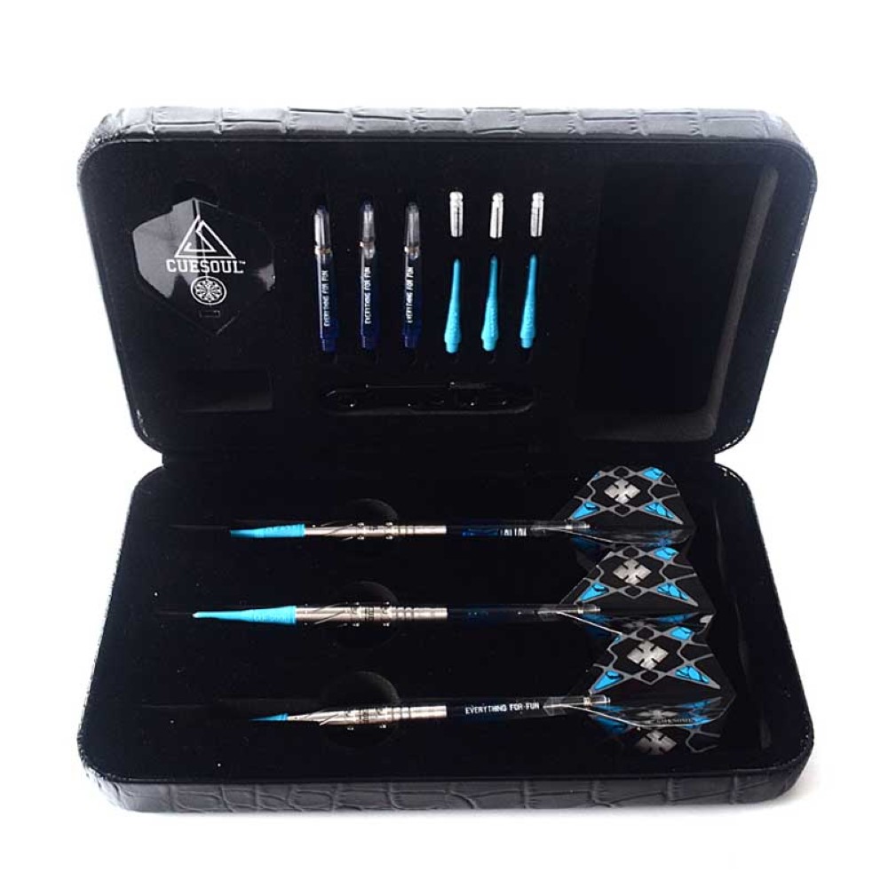 El juego de dardos Fighting Soul 18g se compone por 1 set de 3 cuerpos, 2 set de 3 cañas Cuesoul, 2 set de 3 plumas Cuesoul,1 set de 3 puntas 2ba