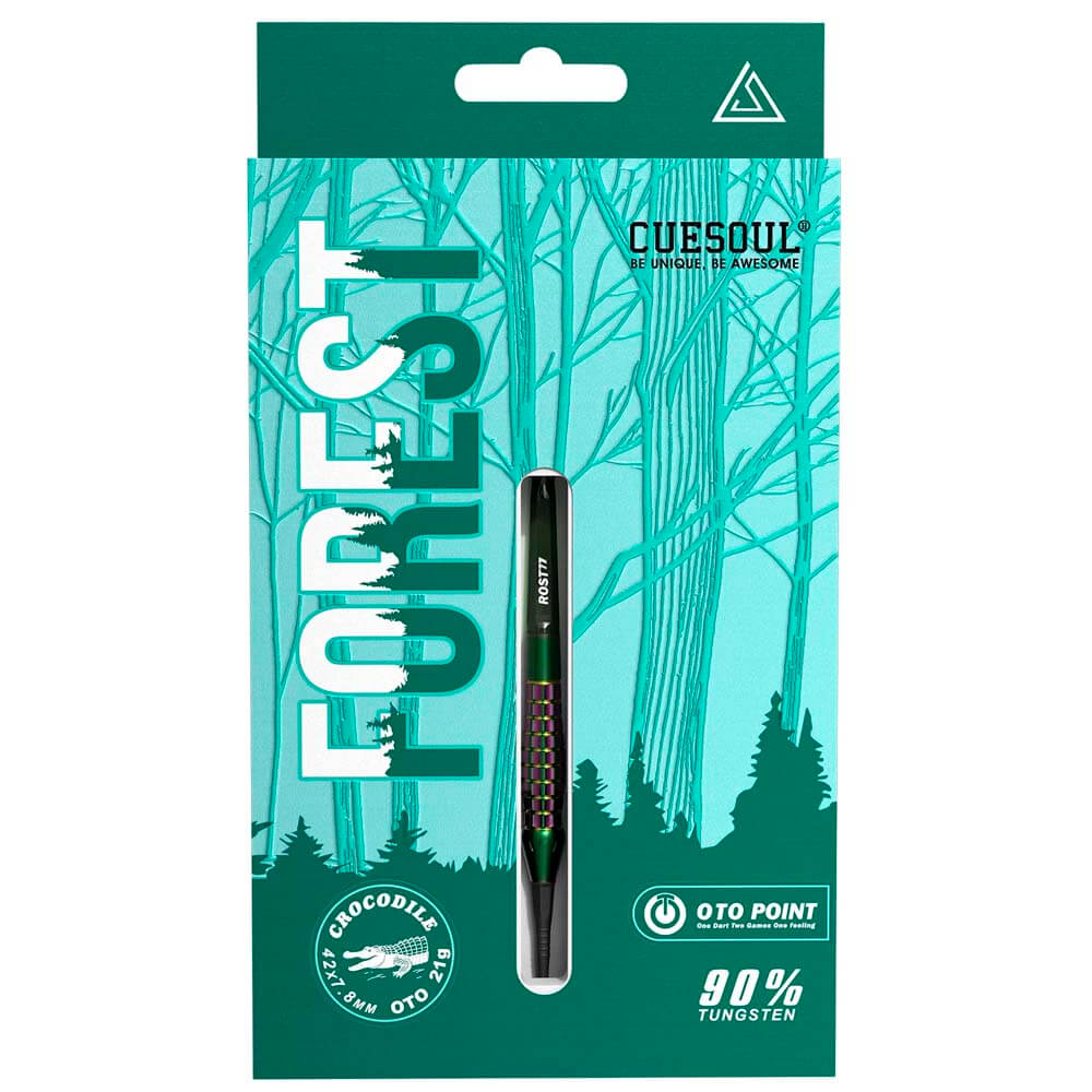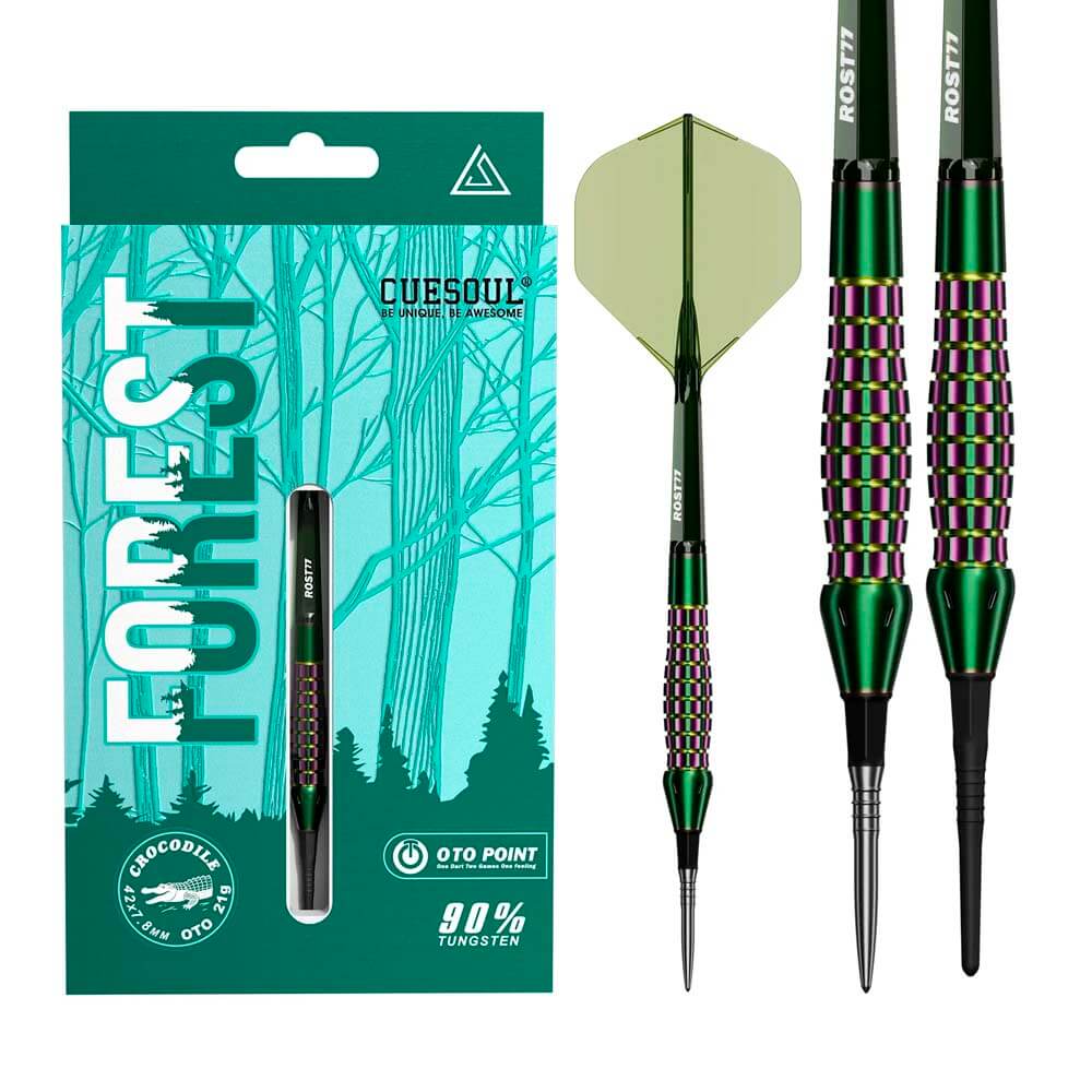 El producto se compone por 1 set de 3 cuerpos de dardos Cuesoul Forest, 1 set de 3 Plumas con caña integrada Cuesoul Rost 77, 1 set de 3 puntas de acero OTO, 9 puntas de plástico OTO y 1 piedra de afilar puntas.