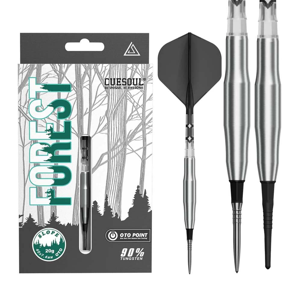El producto se compone por 1 set de 3 cuerpos de dardos Cuesoul Forest, 1 set de 3 Plumas con caña integrada Cuesoul Rost T19, 1 set de 3 puntas de acero OTO, 9 puntas de plástico OTO y 1 piedra de afilar puntas.