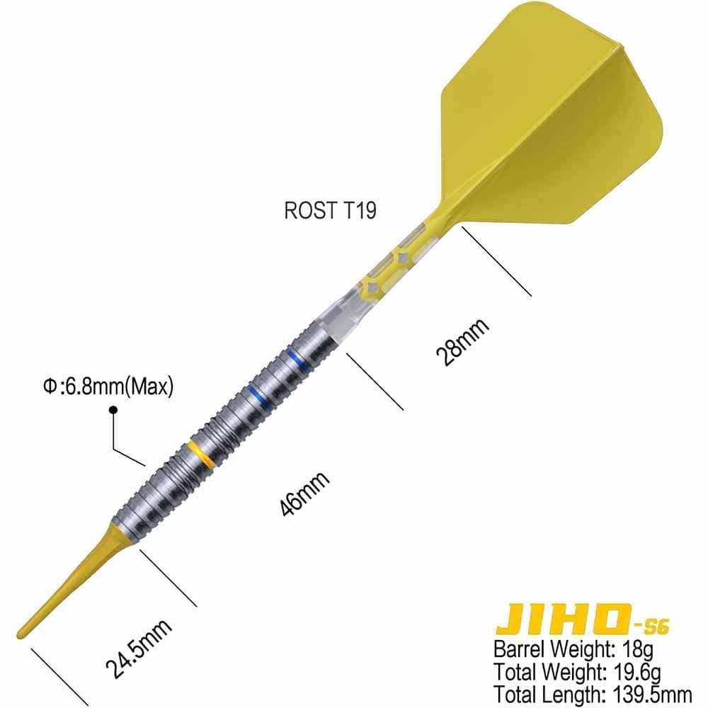 El producto se compone por 1 set de 3 cuerpos de dardos Jiho S6 , 1 set de 3 cañas , 1 set de 3 plumas y 1 set de 3 puntas