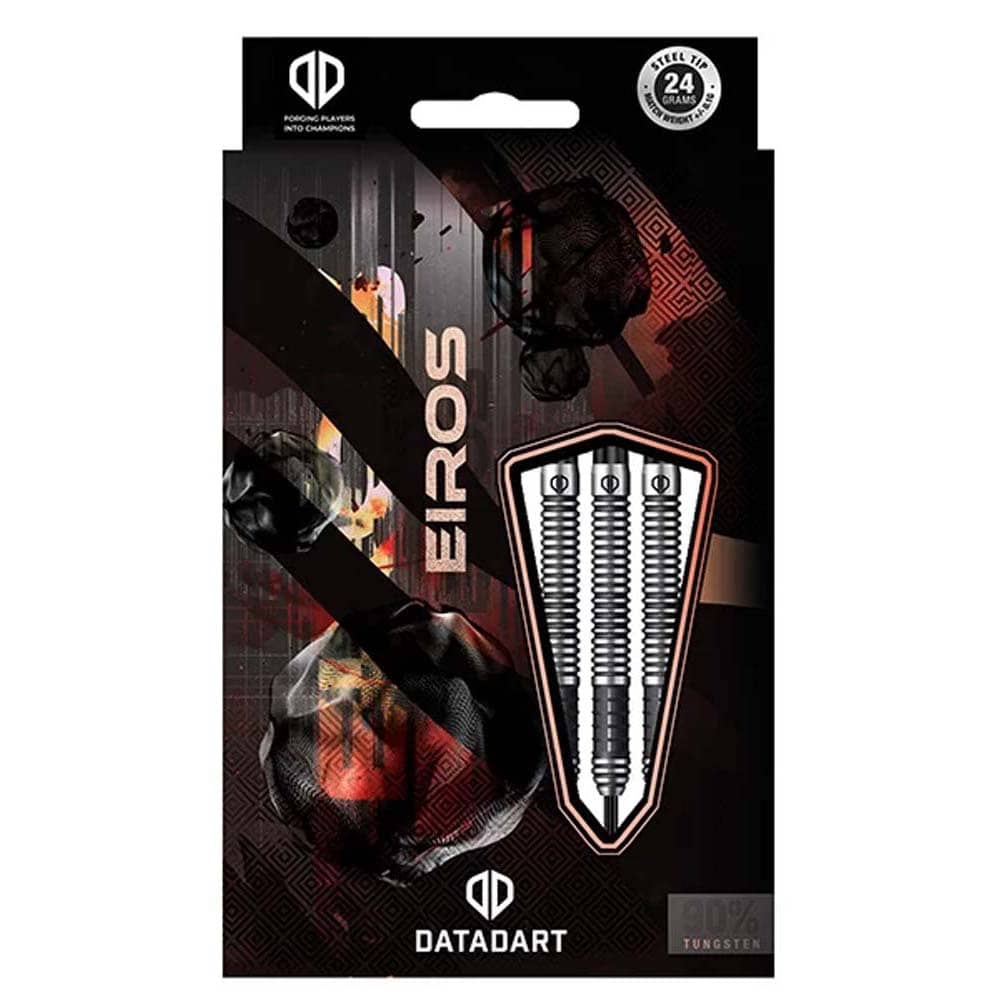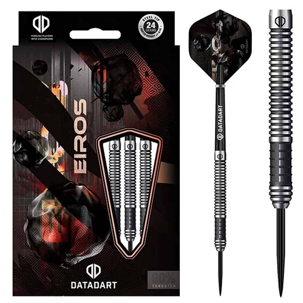 El juego de dardos se compone por 1 set de 3 cuerpos de dardos Datadart Eiros con punta de metal, 1 set de 3 cañas y 1 set de 3 plumas Datadart.