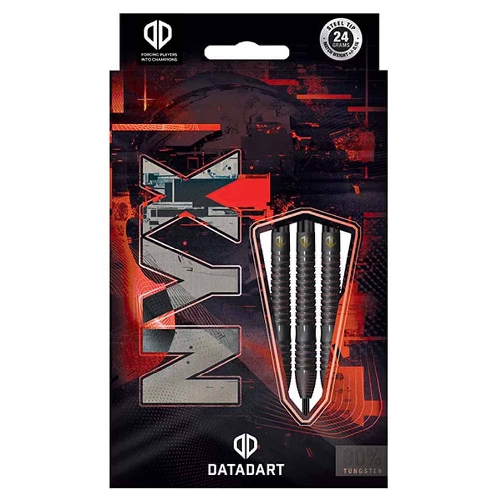 El juego de dardos se compone por 1 set de 3 cuerpos de dardos Datadart NYX con punta de metal, 1 set de 3 cañas y 1 set de 3 plumas Datadart.