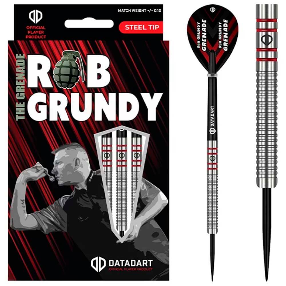 El juego de dardos se compone por 1 set de 3 cuerpos de dardos Datadart Rob Grundy con punta de metal, 1 set de 3 cañas y 1 set de 3 plumas Datadart.