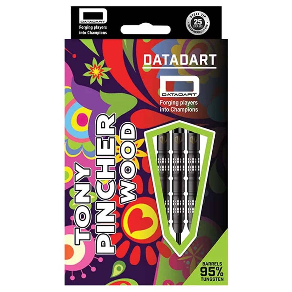 El juego de dardos se compone por 1 set de 3 cuerpos de dardos Datadart Tony Wood con punta de metal, 1 set de 3 cañas y 1 set de 3 plumas Datadart.