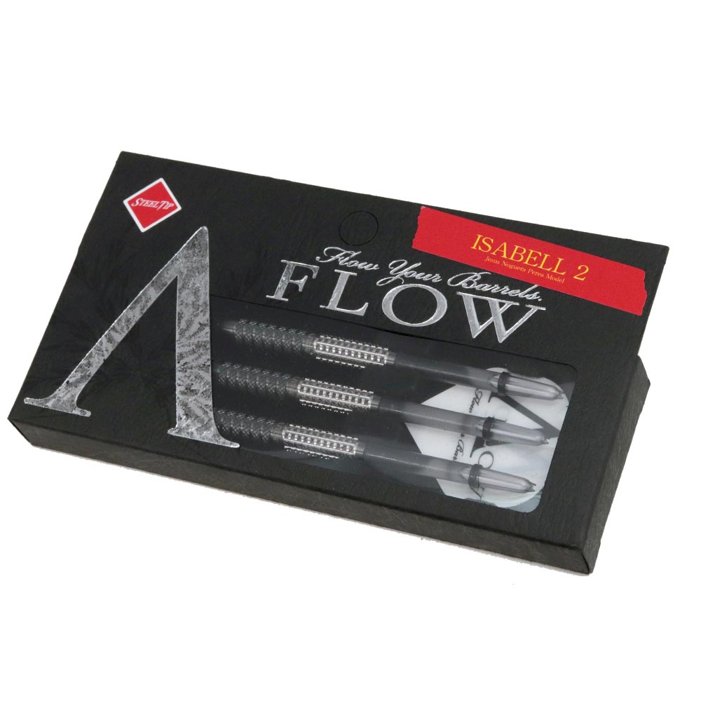 El juego se compone por 1 set de 3 cuerpos de dardos Dynasty A Flow Isabell 2 Jesus Noguera Perea, 1 set de 3 cañas, 1 set de 3 plumas Dynasty y 3 puntas de acero.