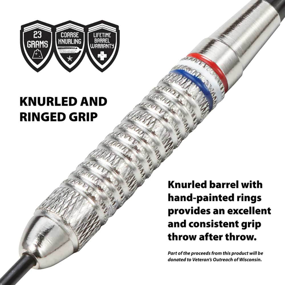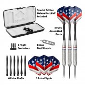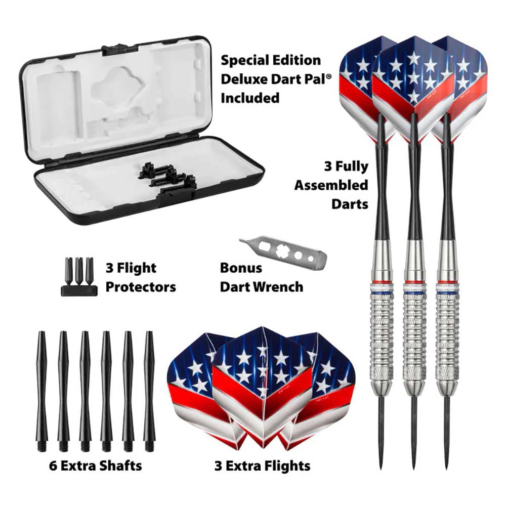 El juego de dardos se compone por 3 cuerpos modelo Support Our Troops viene en una caja de plástico rígido con accesorios adicionales. Cada juego incluye tres dardos de punta de metal, 6 cañas , 6 plumas , 3 protectores, una herramienta para dardos y un estuche de dardos Deluxe Dart Pal.