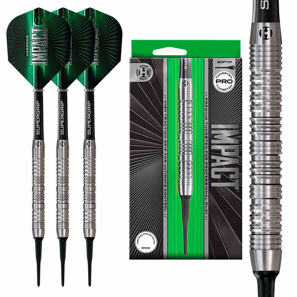 El dardos se compone por 1 set de 3 cuerpos Harrows Darts Impact , 1 set de 3 cañas Harrows , 1 set de 3 plumas Harrows y 1 set de 3 puntas 2ba 4mm