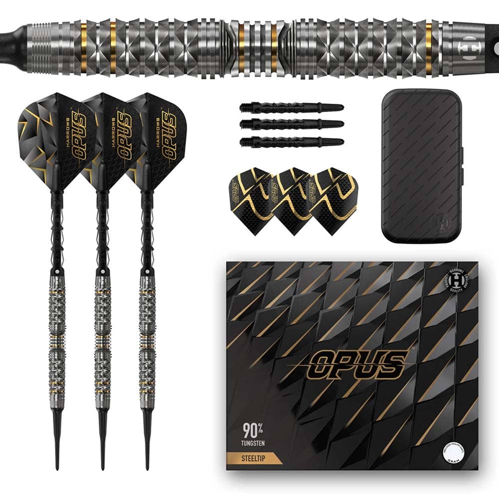 El dardos se compone por 1 set de 3 cuerpos Harrows Darts Opus , 2 set de 3 cañas Harrows , 2 set de 3 plumas Darts, 1 set de 3 puntas 2ba y 1 Slimcase