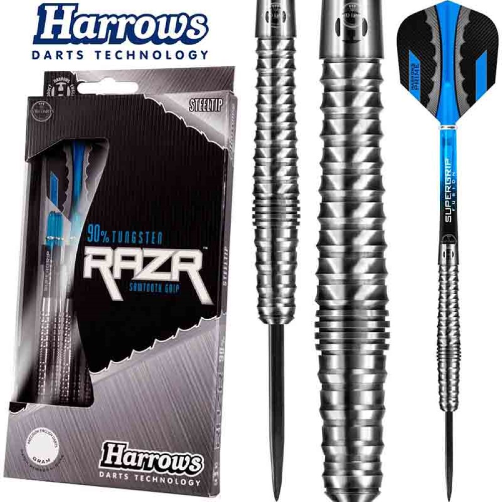 El juego de dardos se compone por 1 set de 3 cuerpos Harrows Razr Bullbous , 1 set de 3 cañas supergrip, 1 set de 3 plumas.