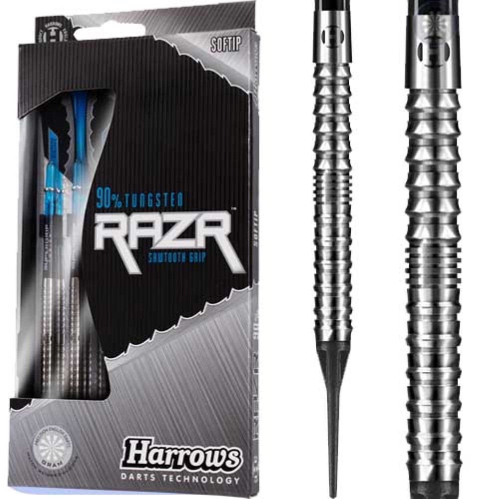 Dardos de gran calidad fabricados por Harrows Darts, modelo Razr , dardos con cuerpo con tres tipos de agarre de gran precisión.