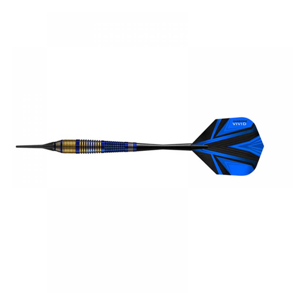 Dardos punta plástico de la marca Harrows Darts, modelo Vivid color azul, dardos fabricados en latón con tres tipos de agarre que aportan un buen tacto y precisión a este dardo de gama inicial.