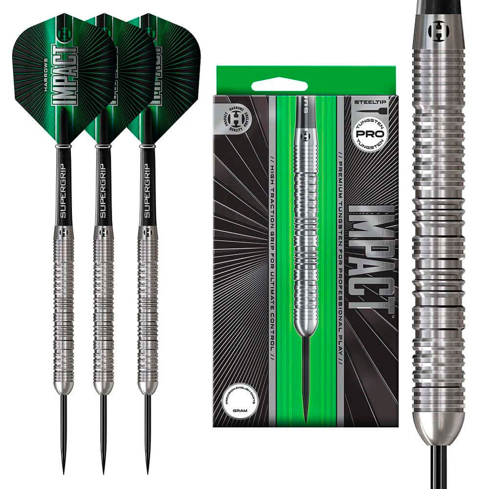 El juego de dardos se compone por 1 set de 3 cuerpos Harrows Darts Impact , 1 set de 3 cañas Supergrip y 1 set de 3 plumas Impact