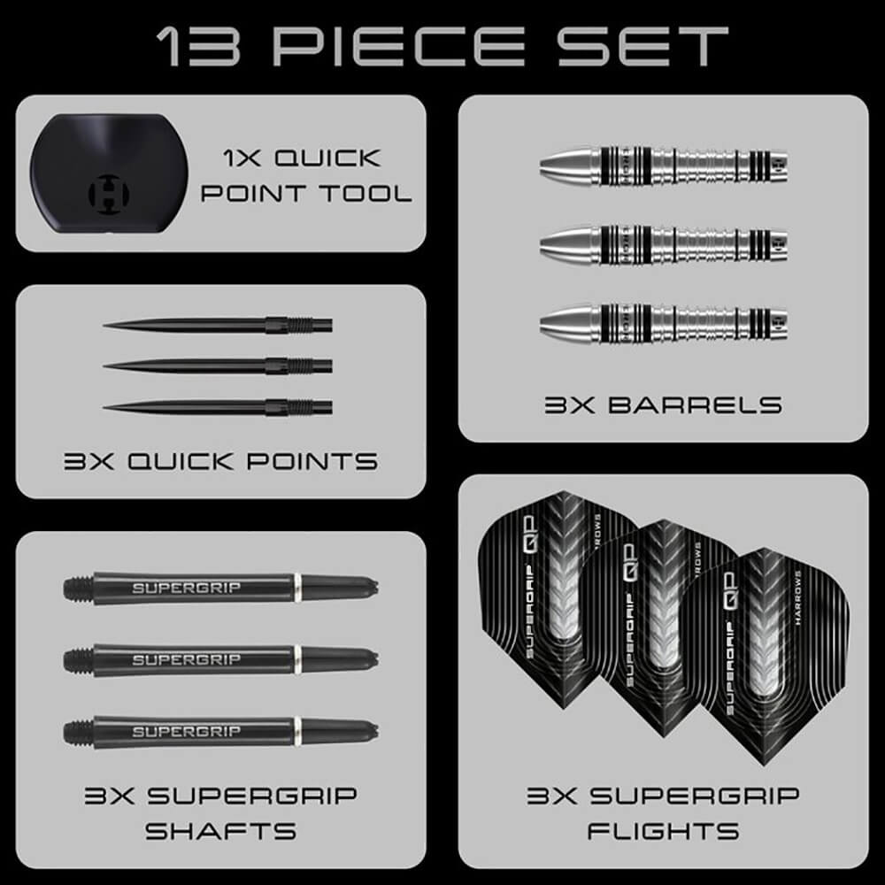 El dardos se compone por 1 set de 3 cuerpos Harrows Darts Supergrip Bomb Quick Point, 1 set de 3 cañas Harrows Supergrip Negro y 1 set de 3 plumas Supergrip Bomb Quick Point original Harrows Darts