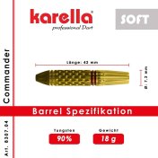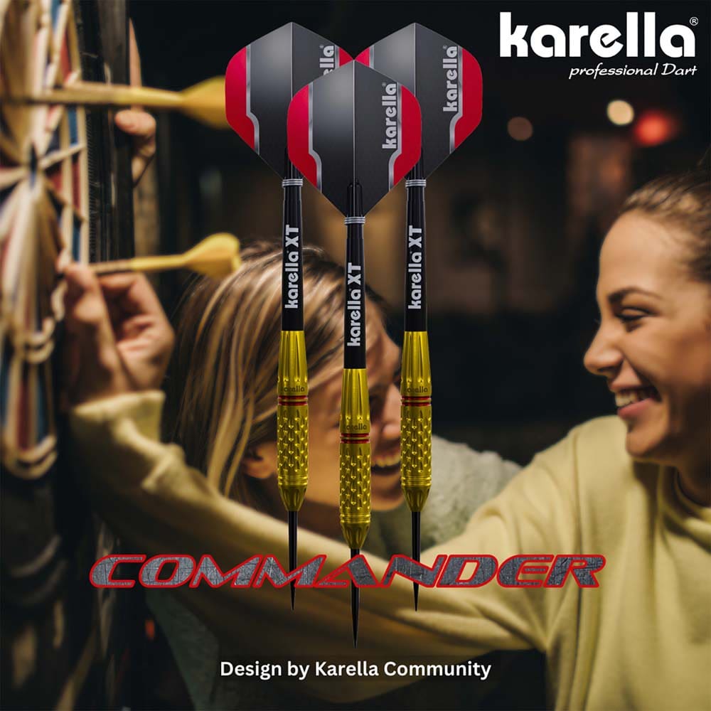 El juego de dardos se compone por 1 set de 3 cuerpos Karella Commander, 1 set de 3 cañas, 1 set de 3 plumas y 1 set de 3 puntas 2ba