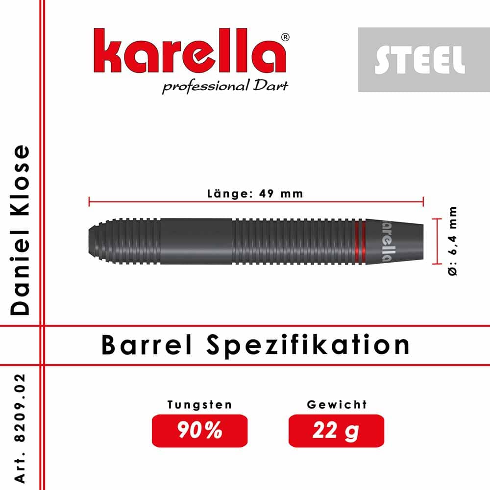 El juego de dardos se compone por 1 set de 3 cuerpos Karella Daniel Klose, 1 set de 3 cañas y 1 set de 3 plumas.