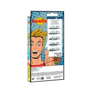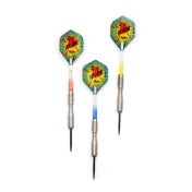 El juego de dardos se compone por 1 set de 3 cuerpos Karella Comic CL-3 con punta de acero, 2 sets de 3 cañas y 1 set de 3 plumas.