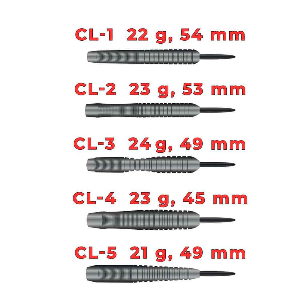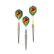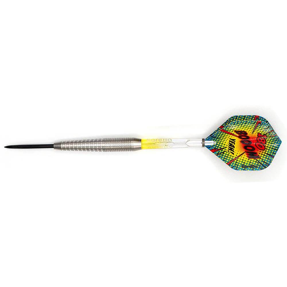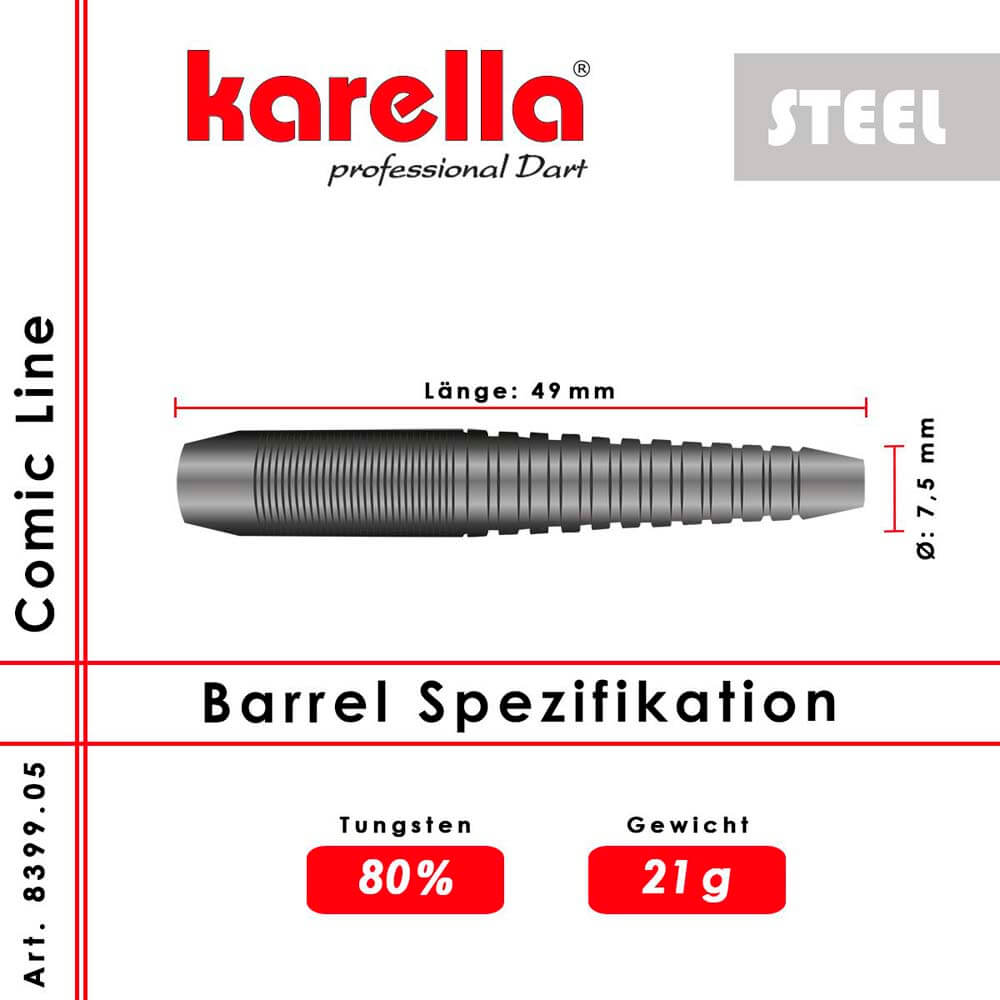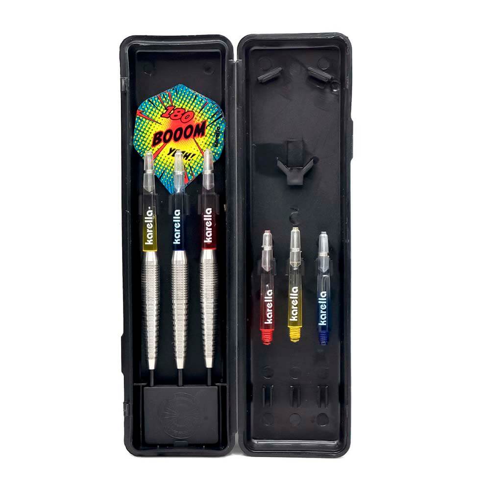 El juego de dardos se compone por 1 set de 3 cuerpos Karella Comic CL-5 con punta de acero, 2 sets de 3 cañas y 1 set de 3 plumas.