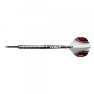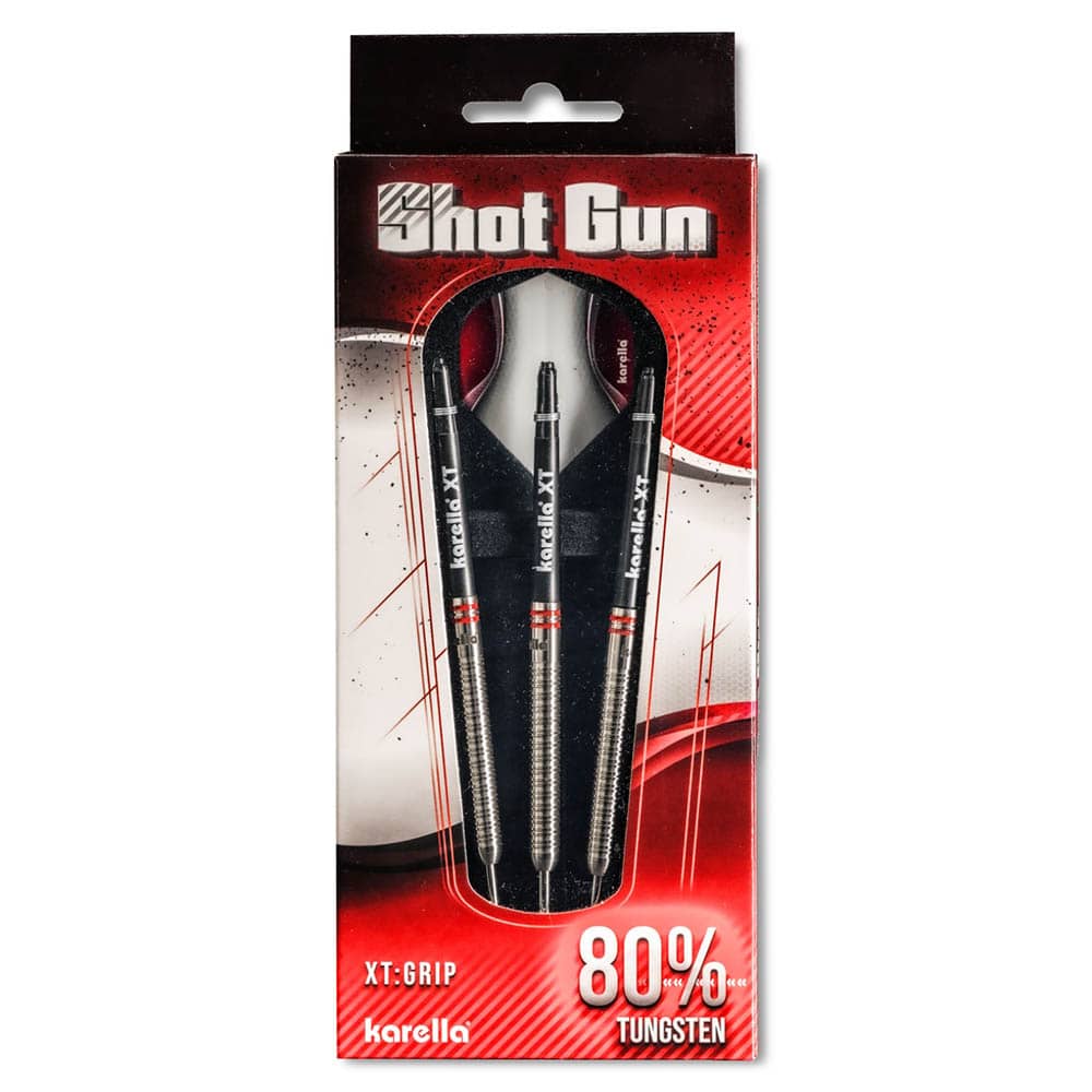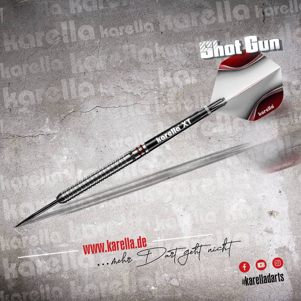 El juego de dardos se compone por 1 set de 3 cuerpos Karella Shotgun, 1 set de 3 cañas, 1 set de 3 plumas y 1 set de 3 puntas Steel Tip