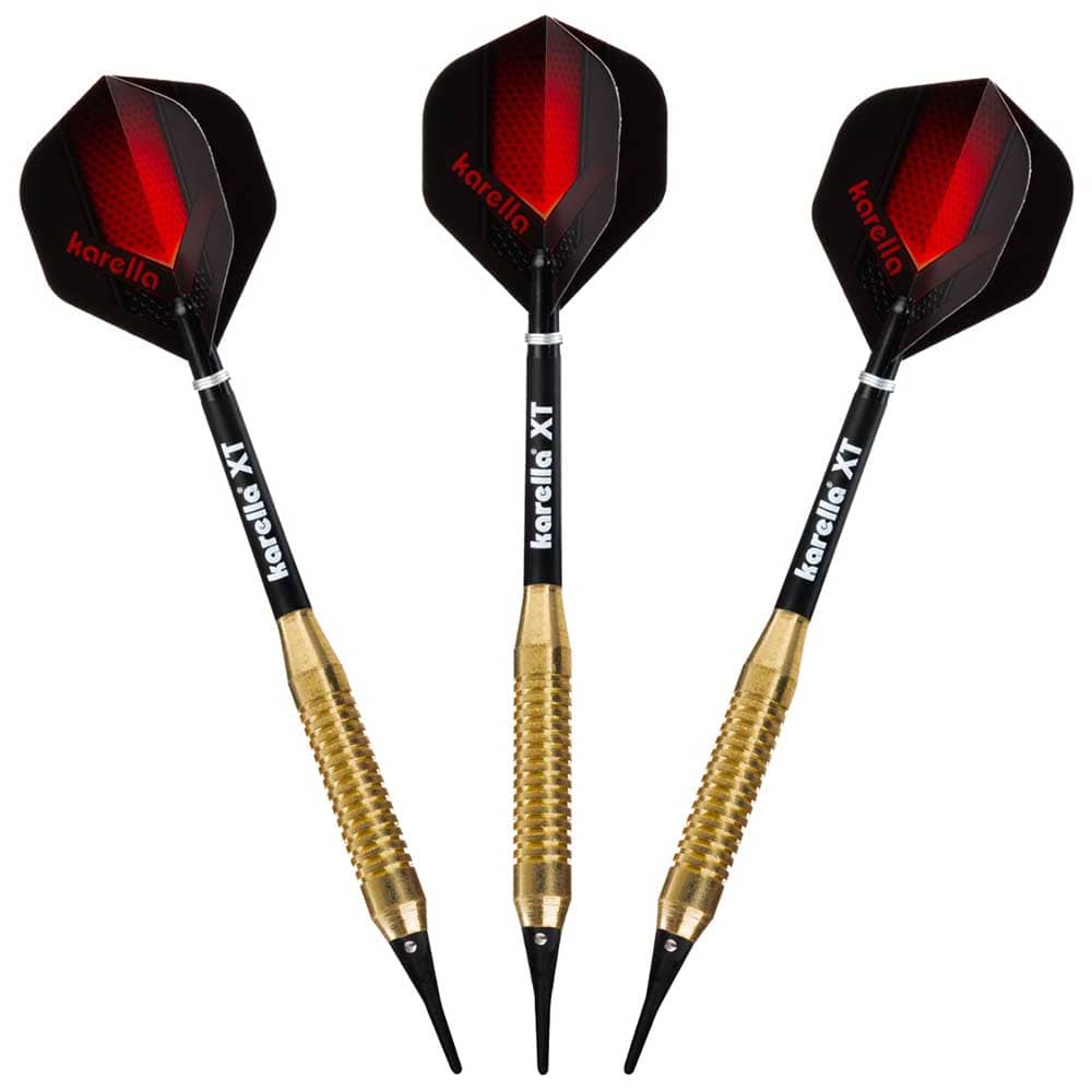 El juego de dardos se compone por 1 set de 3 cuerpos Karella XT 1, 1 set de 3 cañas, 1 set de 3 plumas y 1 set de 3 puntas 2ba