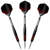El juego de dardos se compone por 1 set de 3 cuerpos Karella XT-2 con punta de acero, 1 set de 3 cañas y 1 set de 3 plumas.