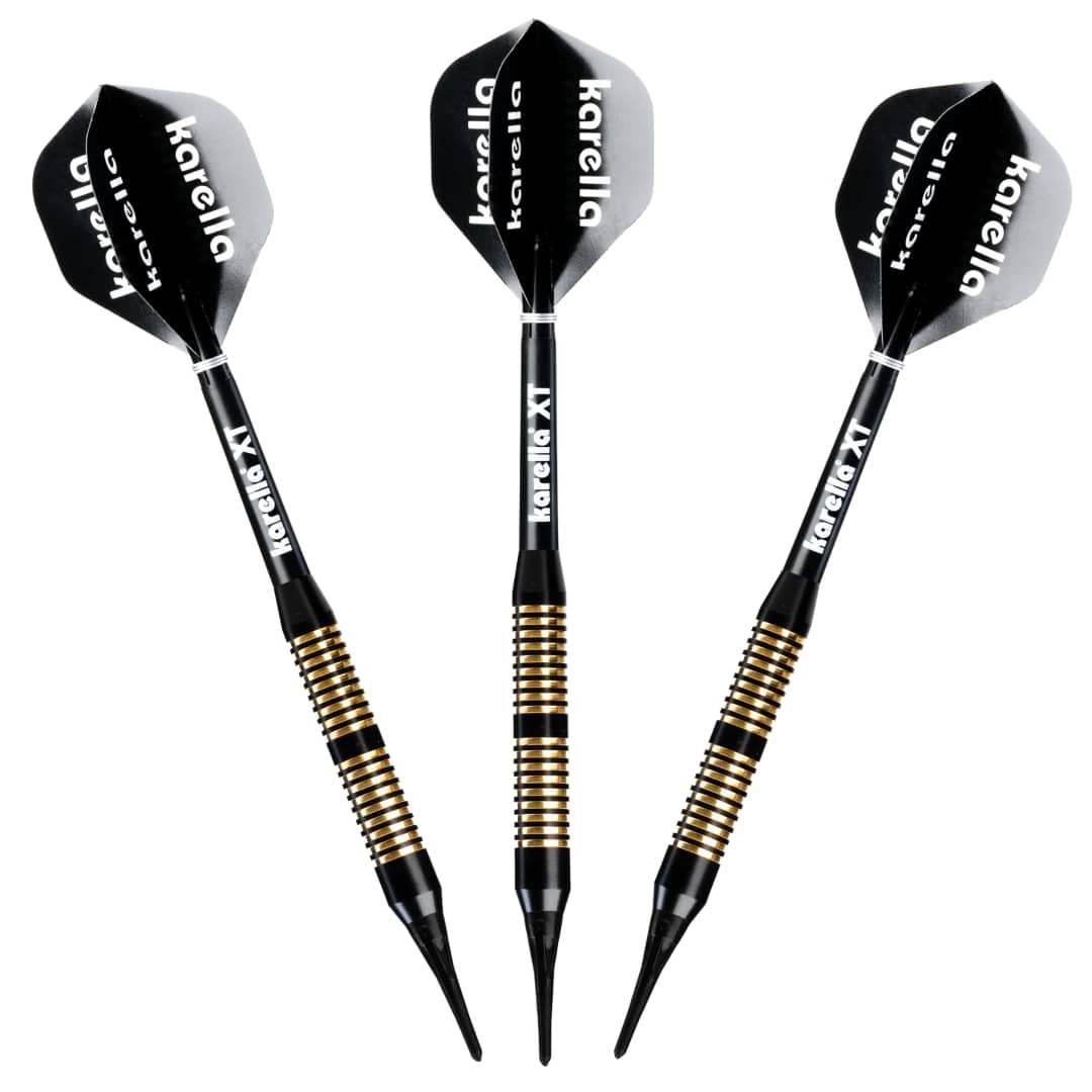 El juego de dardos se compone por 1 set de 3 cuerpos Karella XT 6, 1 set de 3 cañas, 1 set de 3 plumas y 1 set de 3 puntas 2ba