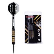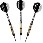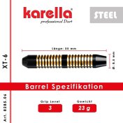 El juego de dardos se compone por 1 set de 3 cuerpos Karella XT-6 con punta de acero, 1 set de 3 cañas y 1 set de 3 plumas.