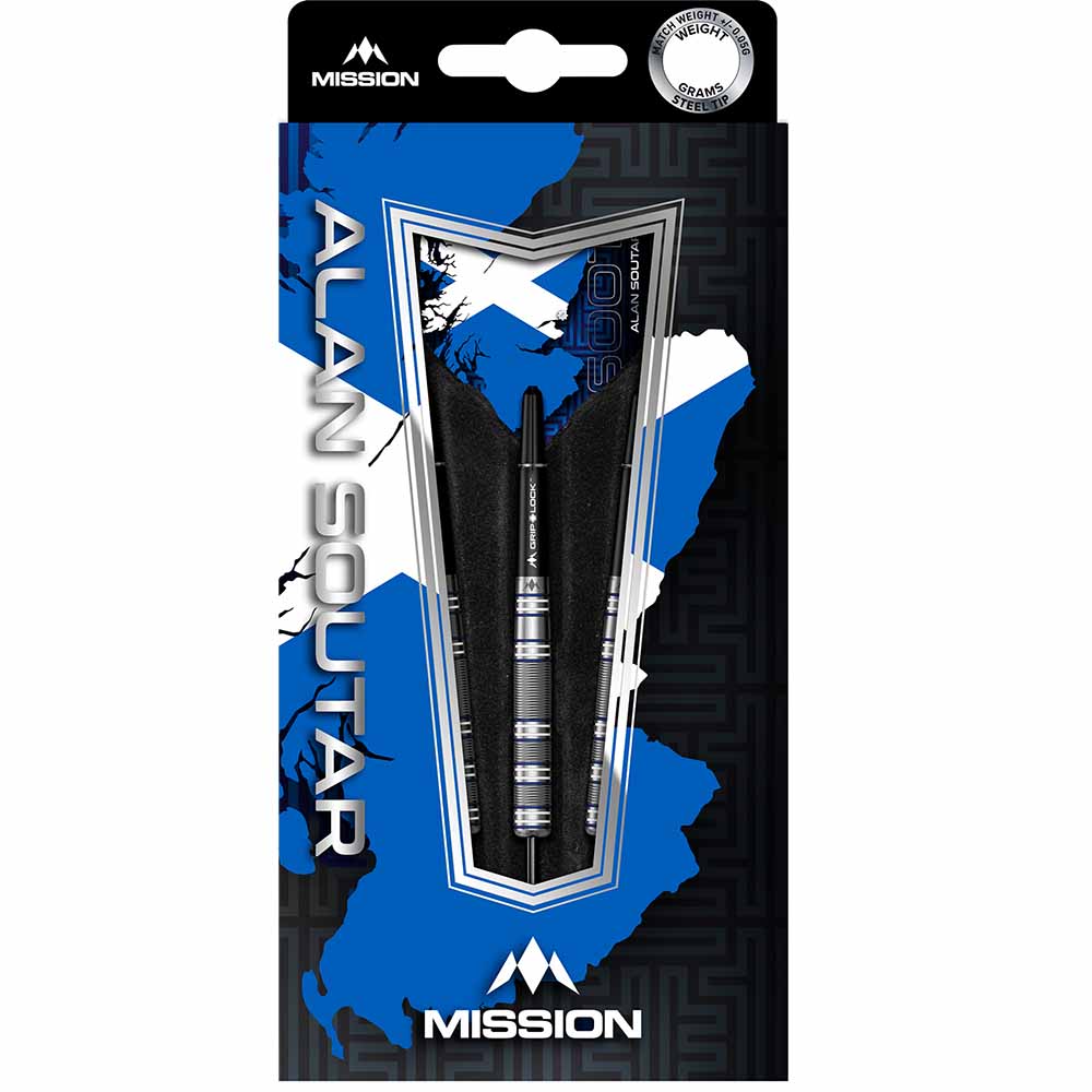 El juego de dardos se compone por 1 set de 3 cuerpos de dardos Alan Soutar Soots con puntas de acero, 1 set de 3 cañas Mission y 1 set de 3 plumas Mission.