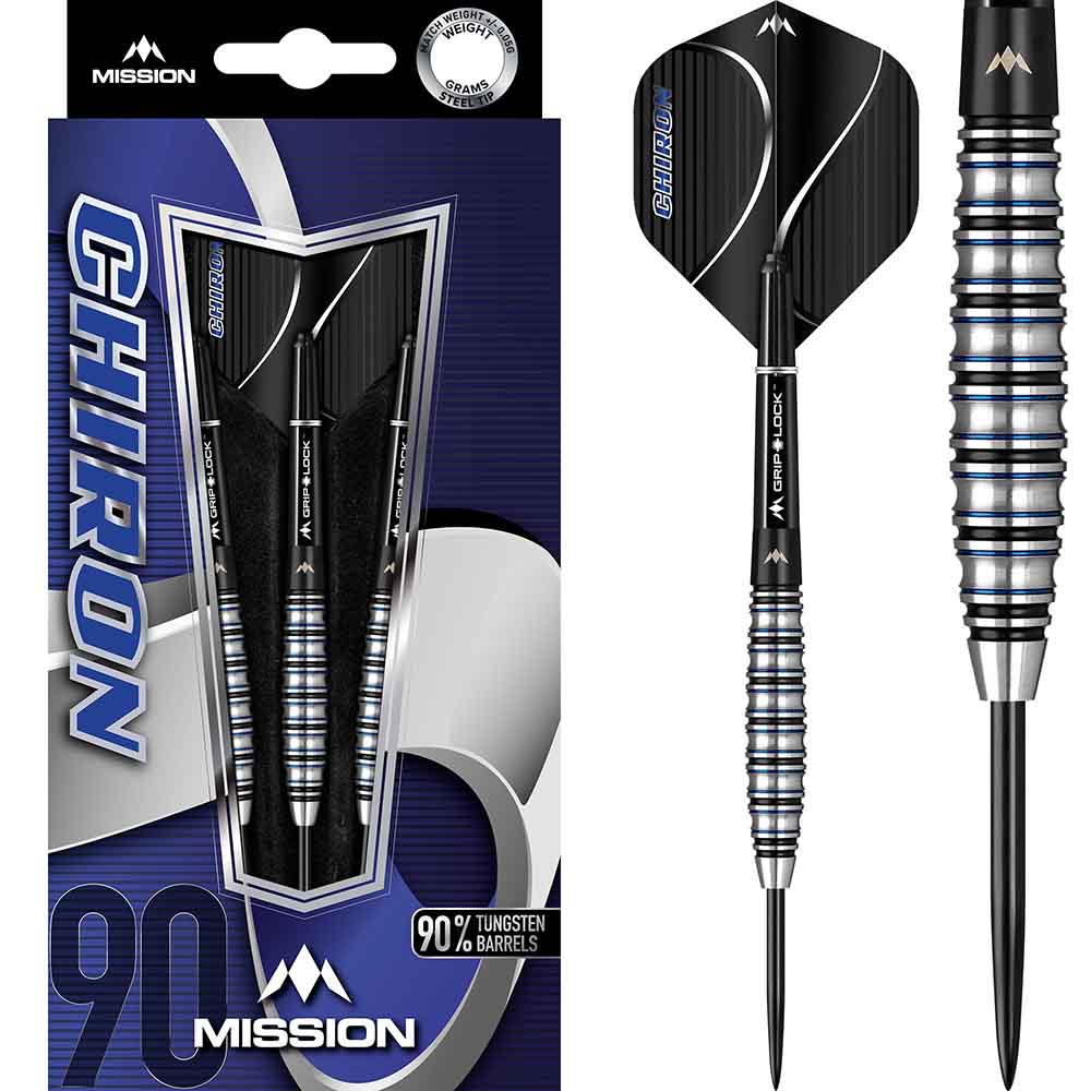 El juego de dardos se compone por 1 set de 3 cuerpos de dardos Mission con puntas de acero, 1 set de 3 cañas Mission y 1 set de 3 plumas Mission.