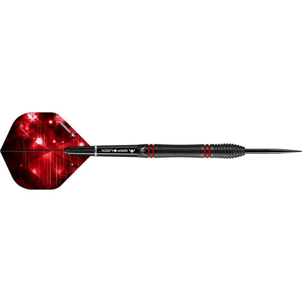 El juego de dardos se compone por 1 set de 3 cuerpos de dardos Mission con puntas de acero, 1 set de 3 cañas Mission y 1 set de 3 plumas Mission.