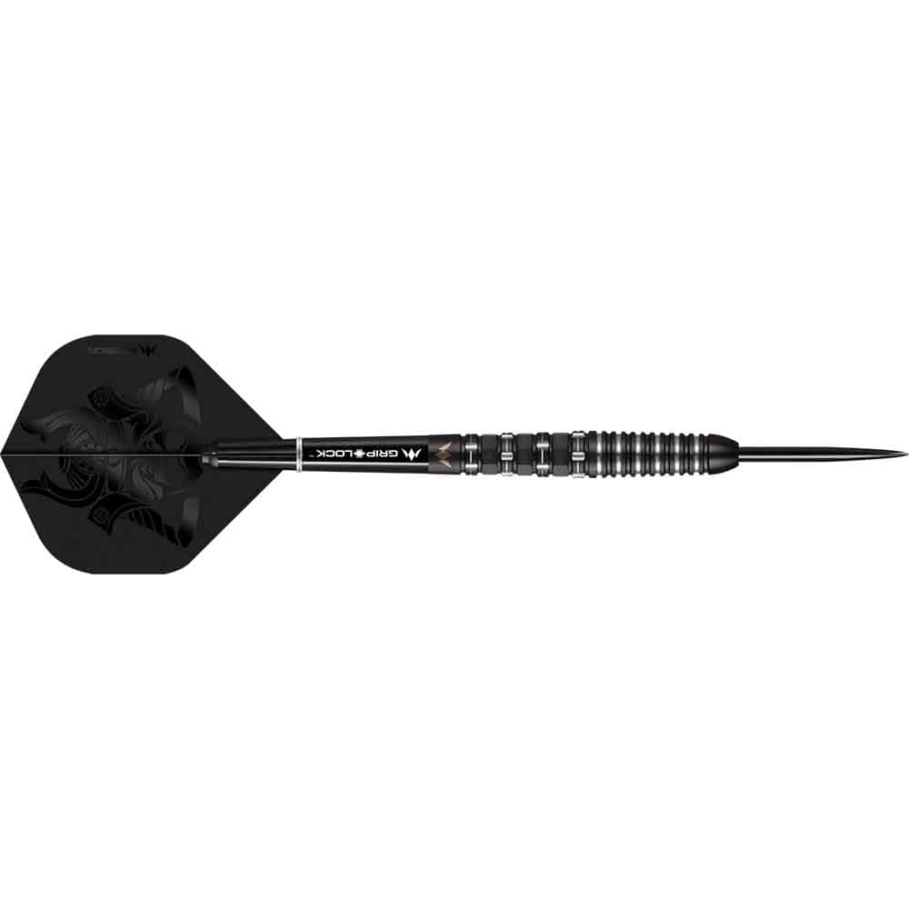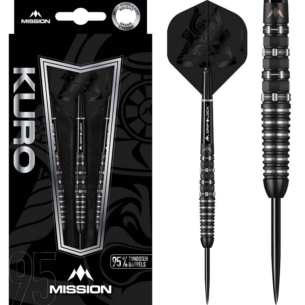 El juego de dardos se compone por 1 set de 3 cuerpos de dardos Mission con puntas de acero, 1 set de 3 cañas Mission y 1 set de 3 plumas Mission.