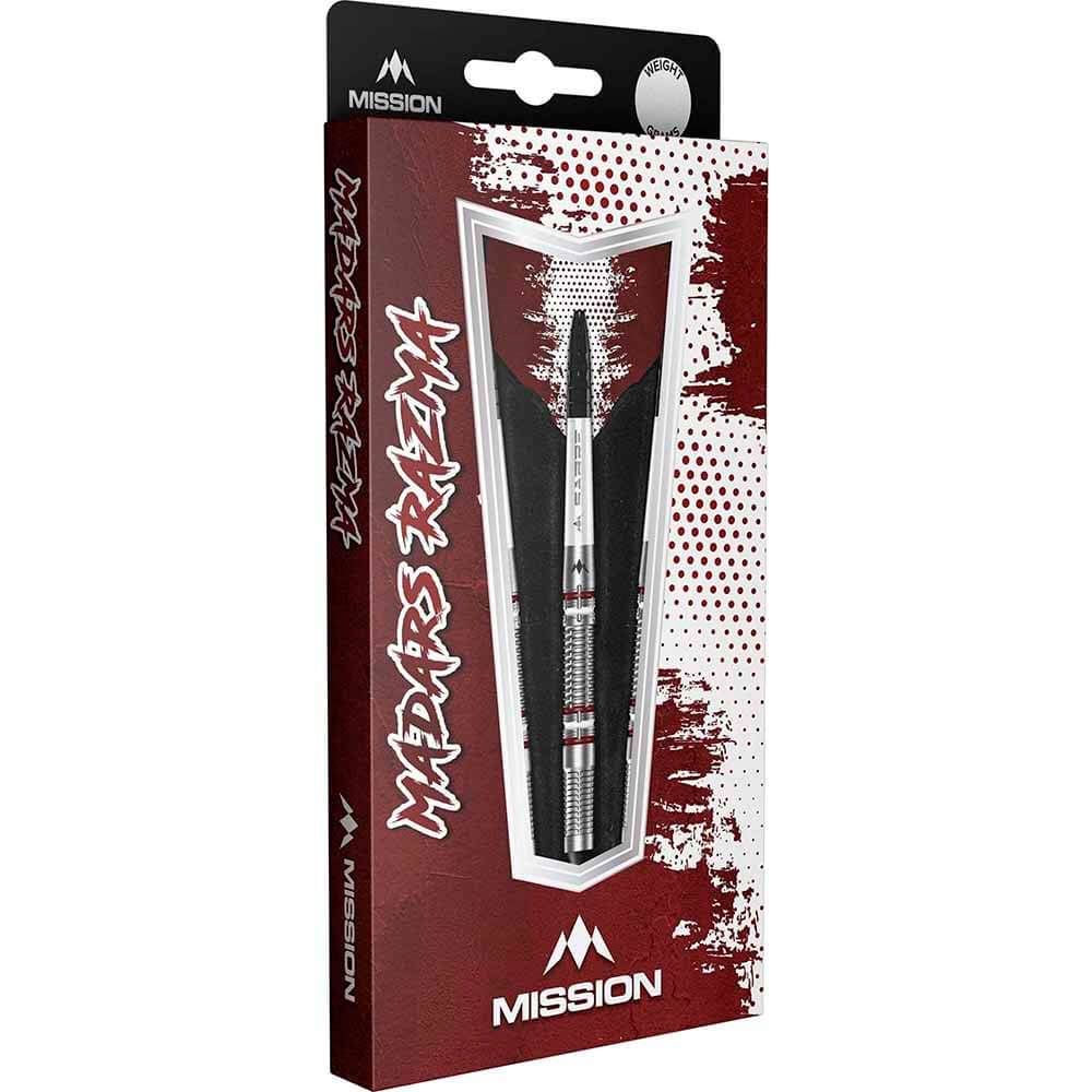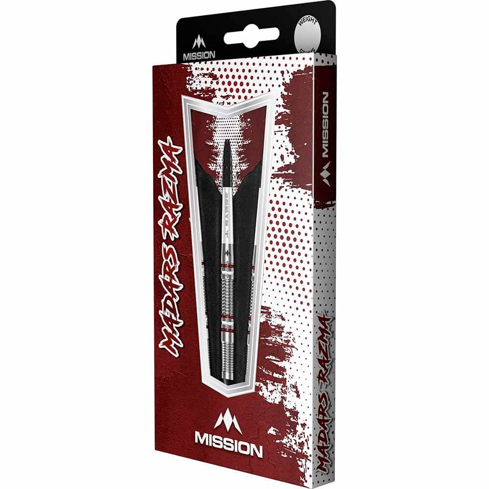 El juego de dardos Zero se compone por 1 set de 3 cuerpos de dardos Mission Madars Razma, 1 set de 3 cañas, 1 set de 3 plumas. y 1 set de 3 puntas 2ba 4mm