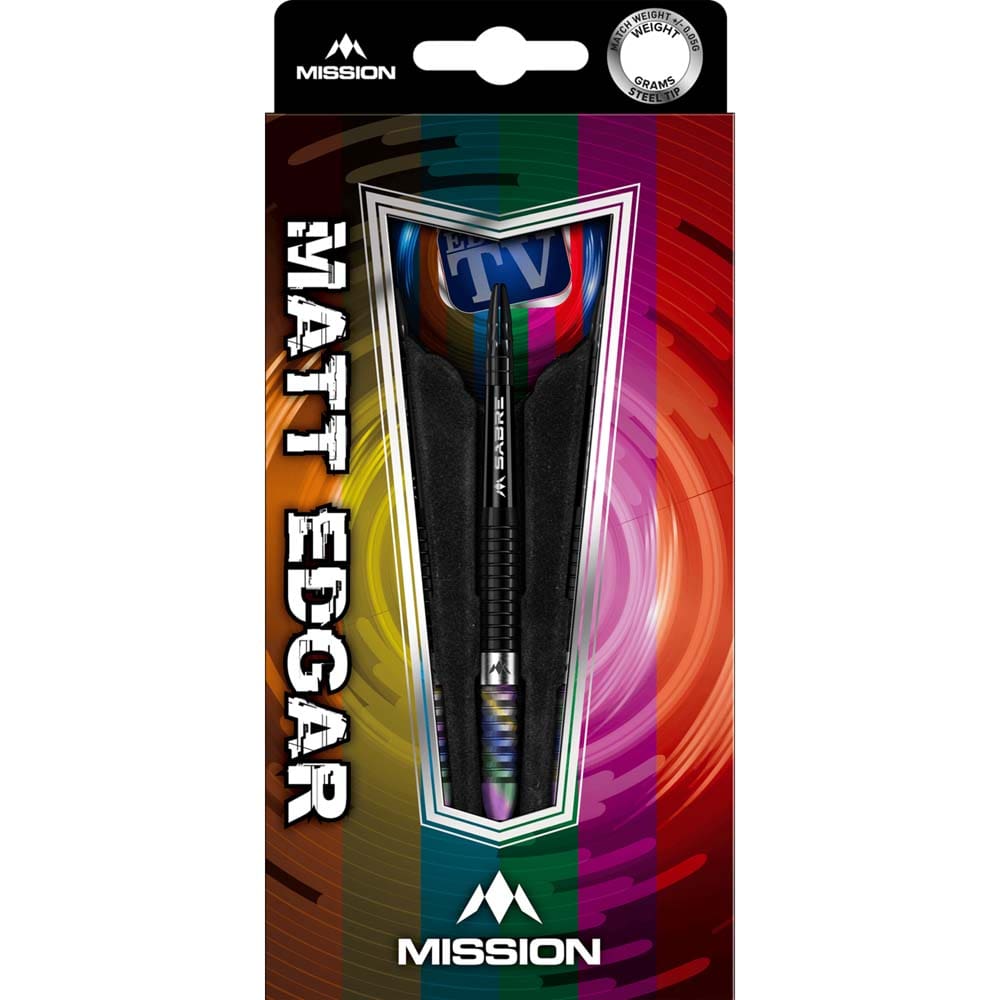 El juego de dardos se compone por 1 set de 3 cuerpos de dardos Mission Matthew Edgar con puntas de acero, 1 set de 3 cañas Mission y 1 set de 3 plumas Mission.